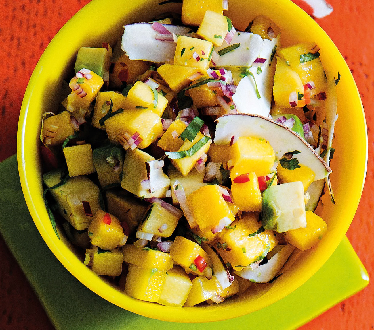 Mango Coconut Salsa Mango Coconut Salsa / Combine 1/2 tsp chili powder, 1/2 tsp cayenne pepper, 1/2 tsp cumin and 1/2 tsp salt and sprinkle over shrimp.