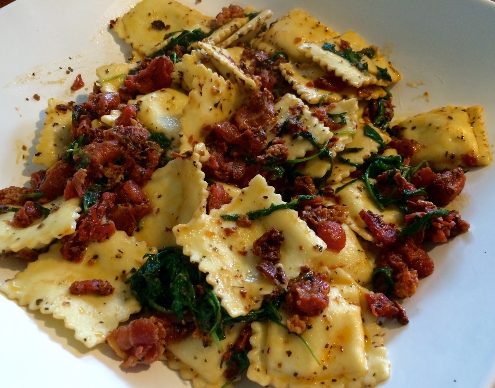 Tomato And Pancetta Ravioli Tomato And Pancetta Ravioli / Ravioli, marinara sauce, spinach, and parmesan.